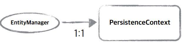 우선 PersistenceContext (영속성 컨텍스트)는 EntityManager 와 1:1 관계를 가진다.