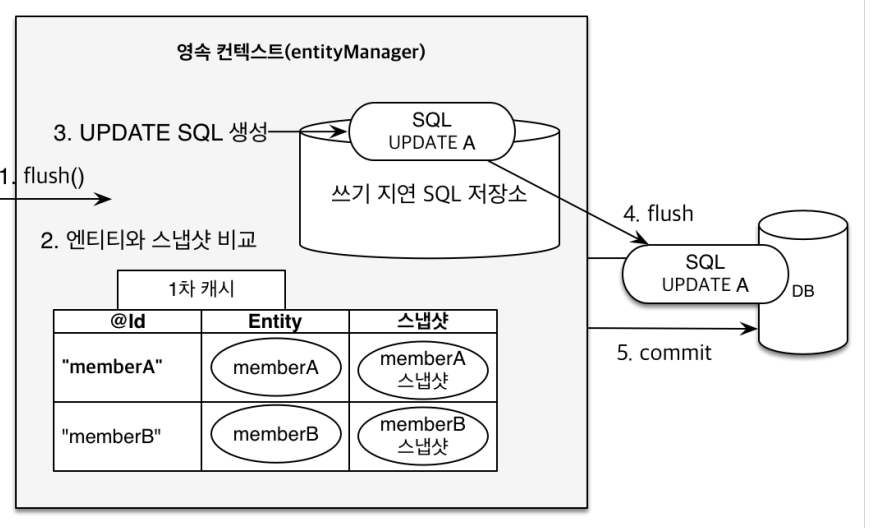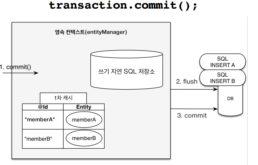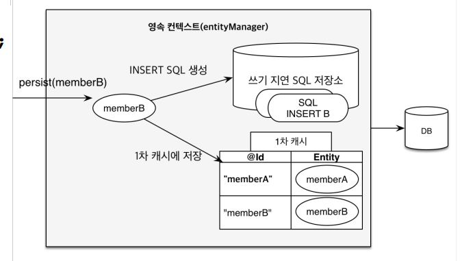 1차 캐시에 엔티티가 등록됨가 동시에, 쓰기 지연 SQL 저장소에 SQL 문들이 쌓인다.