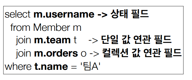 | 연관필드 | 단일 값 연관필드 | - @ManyToOne, @OneToMany 대상이 엔티티 - 묵시적 내부조인 발생 -> 명시적 조인을 사용하자 |