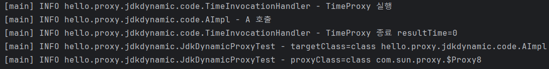 jdkdynamic.code.AImpl : jdk 동적 프록시를 이용하여 프록시 객체가 생성된 것을 알 수 있다.