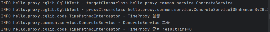 ConcreteService 는 인터페이스가 없는 구체 클래스이다. 여기에 CGLIB를 사용해서 프록시를 생성했다.