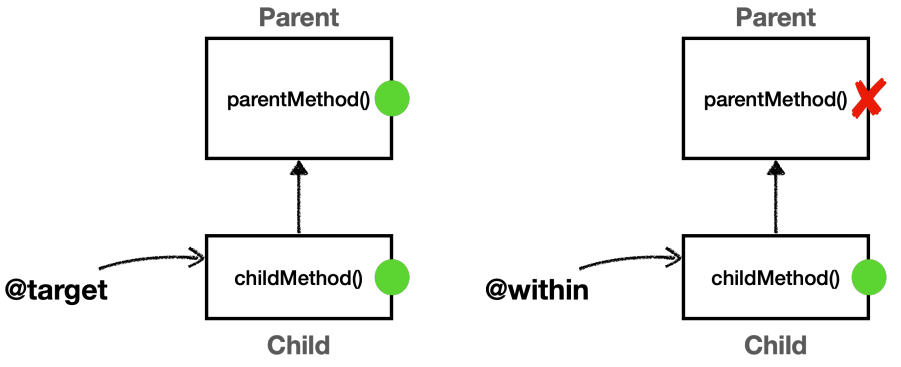 Child 클래스에 정의되어 있지 않기 때문에 @within 에서 AOP 적용 대상이 되지 않는다.