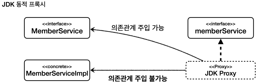JDK 동적 프록시는 대상 객체인 MemberServiceImpl 타입에 의존관계를 주입할 수 없다.