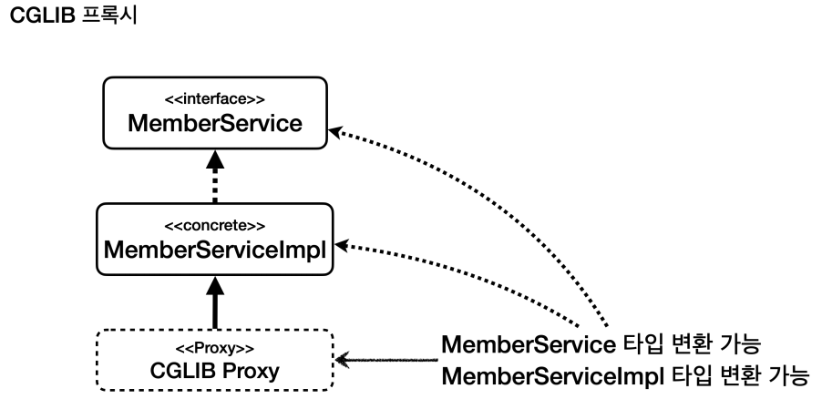 CGLIB은 구체 클래스 기반으로 프록시를 생성하므로, 타입변환 문제가 발생하지 않는다.