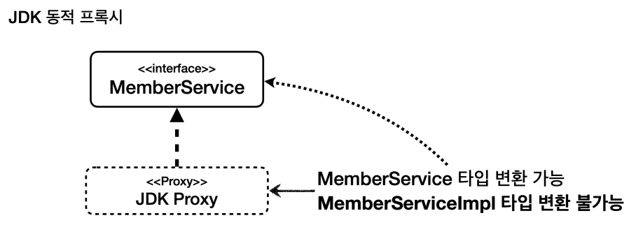 따라서 JDK Proxy는 MemberService 로 캐스팅은 가능하지만 MemberServiceImpl 이 어떤 것인지 전혀 알지 못한다.