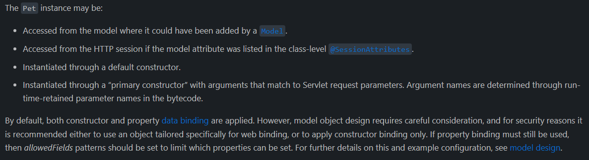 By default, both constructor and property data binding are applied. However, model object design requires careful consideration, and for security reasons it is recommended either to use an object tailored specifically for web binding, or to apply construct