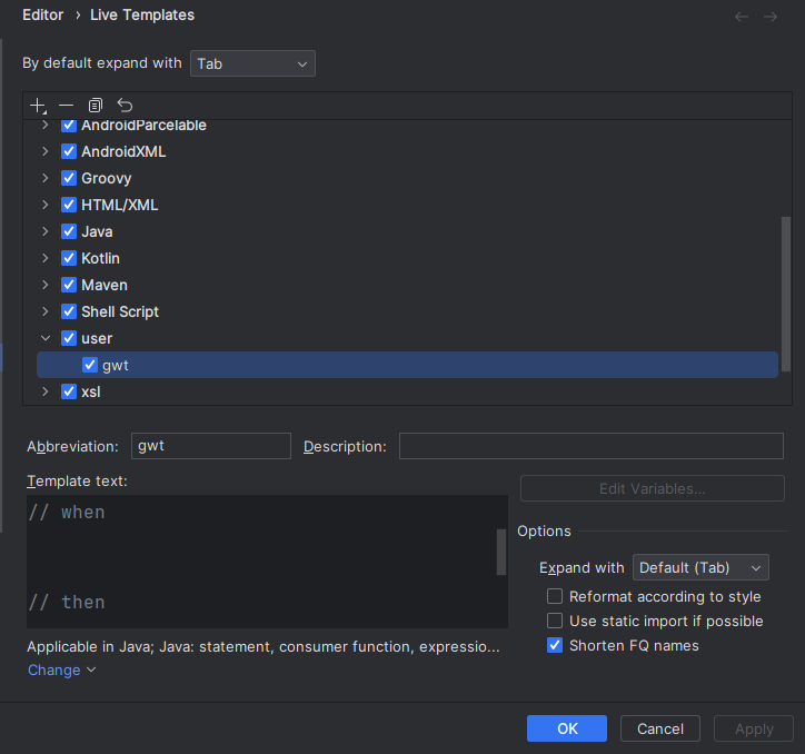 나는 given, when, then 의 앞글자를 따서 'gwt' 로 설정했다.