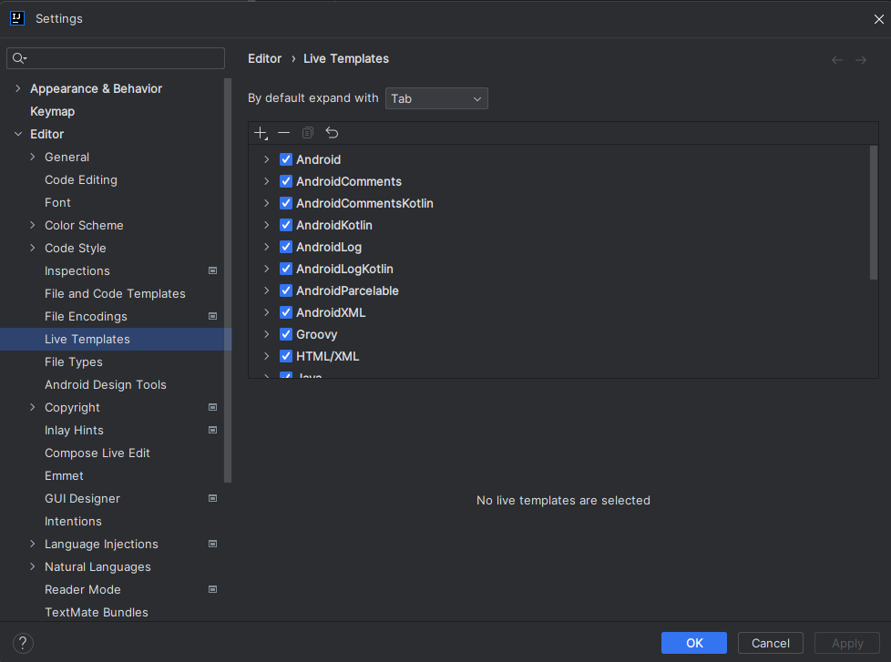 2. Live Templates 창에서 + 버튼을 눌러 새로운 템플릿 그룹을 추가하거나 기존 그룹을 선택한다.