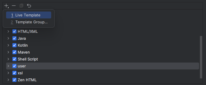 그룹에 템플릿을 추가하려면 Live Template을 선택한다.