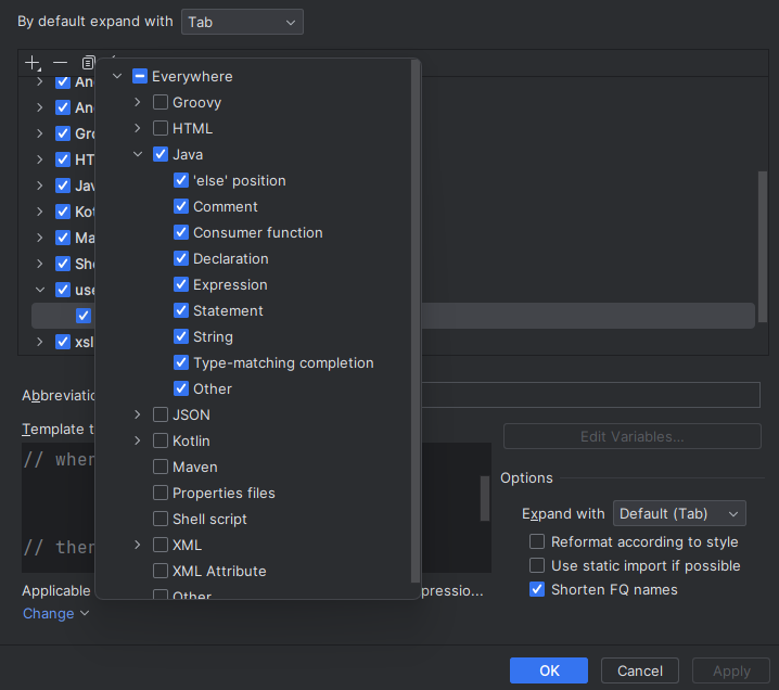 5. Define 버튼을 눌러 템플릿을 적용할 컨텍스트를 설정한다. Java 코드에 적용하려면 Java를 선택한다.