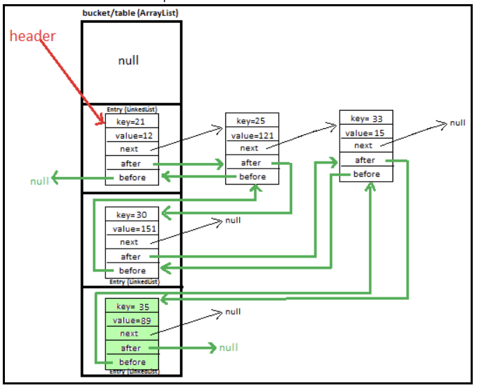 LinkedHashMap 은 동일한 해시값을 가지는 엔티티를 버킷테이블(ArrayList) 의 동일한 배열값에 배치한다.