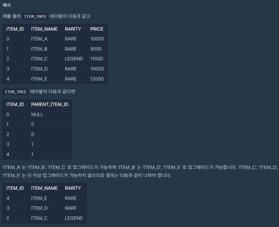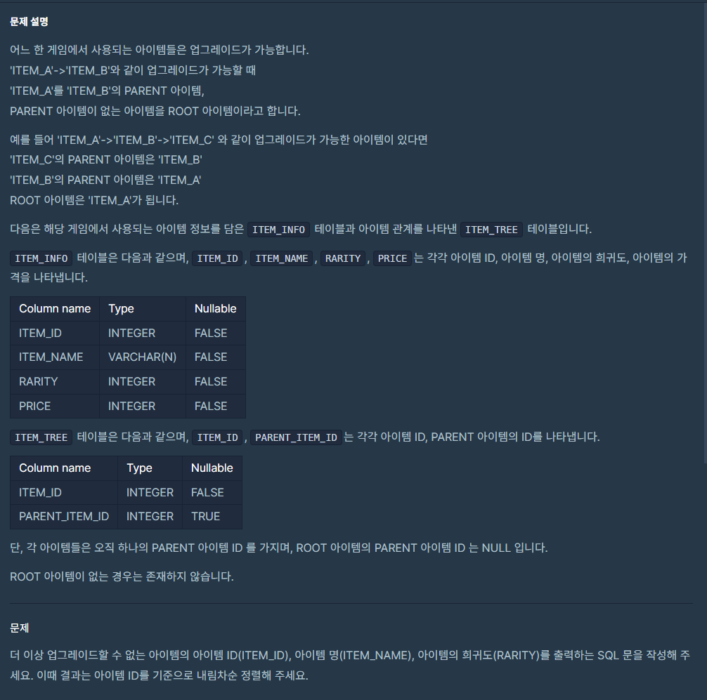 (ITEM_TREE 테이블에서 PARENT_ITEM_ID 값이 없는 ITEM_ID를 구한다)