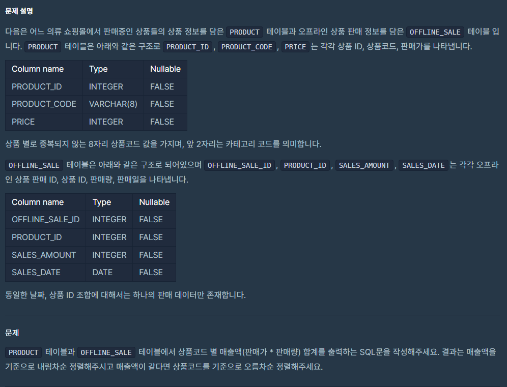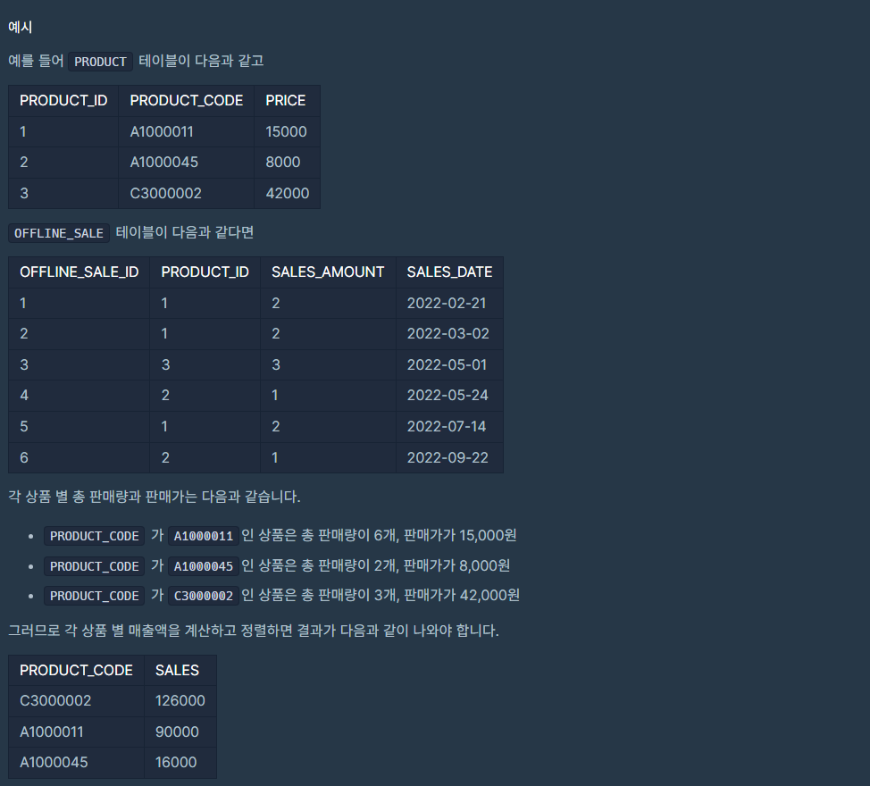 [SQL] 상품 별 오프라인 매출 구하기 본문