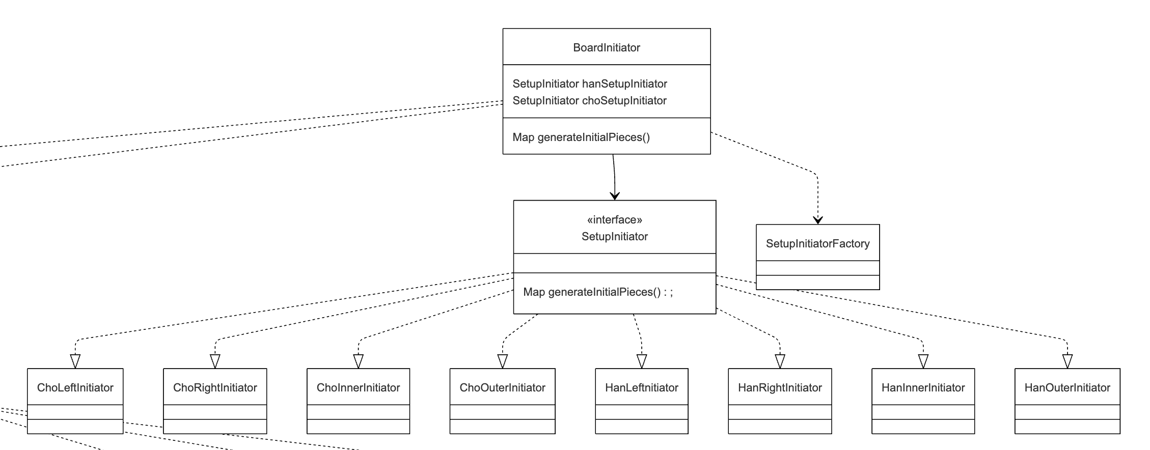 `BoardInitiator`는 각 상차림 기물이 어떻게 기물을 배치하는지 전혀 모른다. `SetupInitiatorFactory` 가 조건에 맞는 상차림 구현체