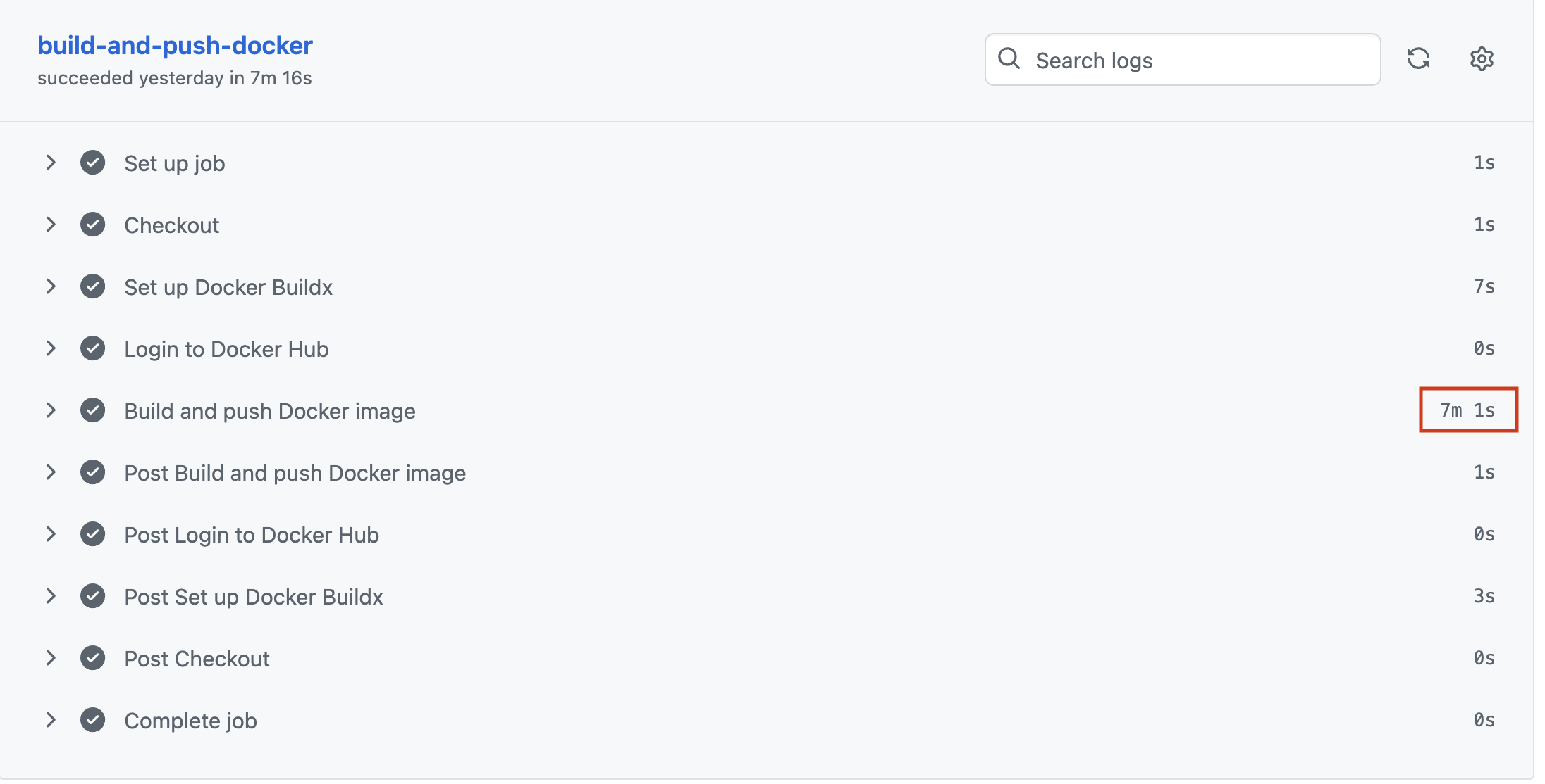 Build and push Docker image 단계에서 7분이 넘는 시간이 걸린다.