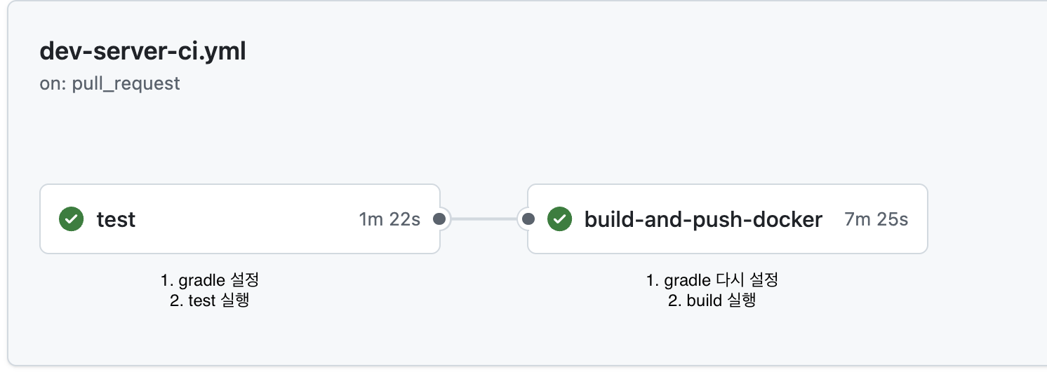 CI 는 test 와 build and push 두 단계로 이루어져 있는데, test 과정에서 큰 시간 지연은 없다.