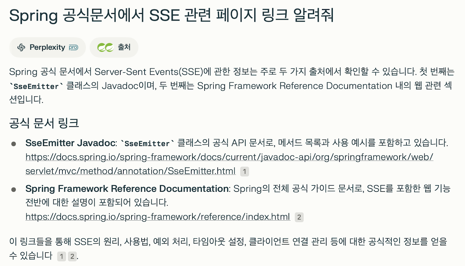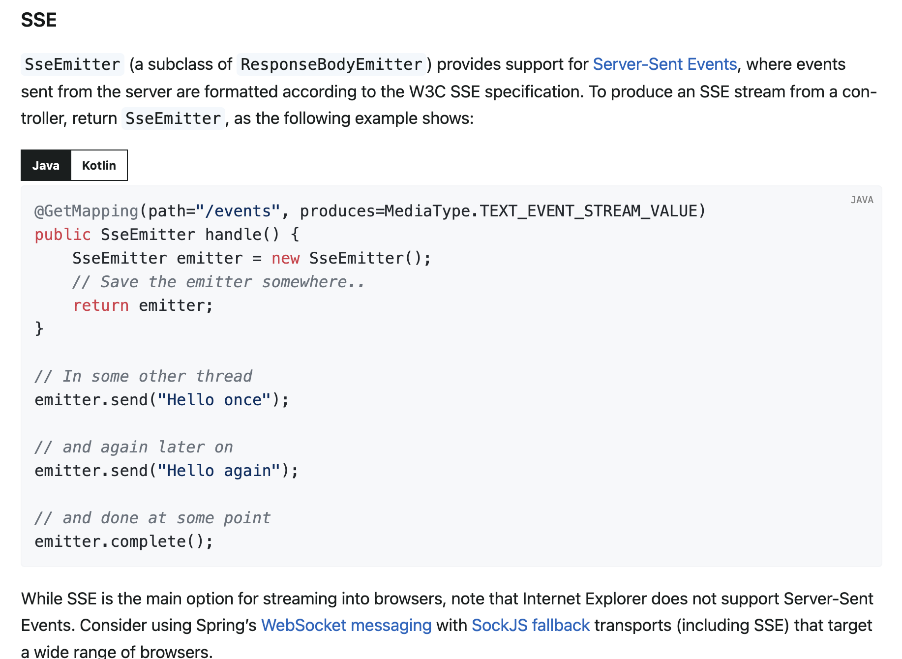 방대한 Spring 공식문서에서 정확히 SSE 기술의 원리와 사용법을 알려주는 부분을 쉽게 찾을 수 있다.