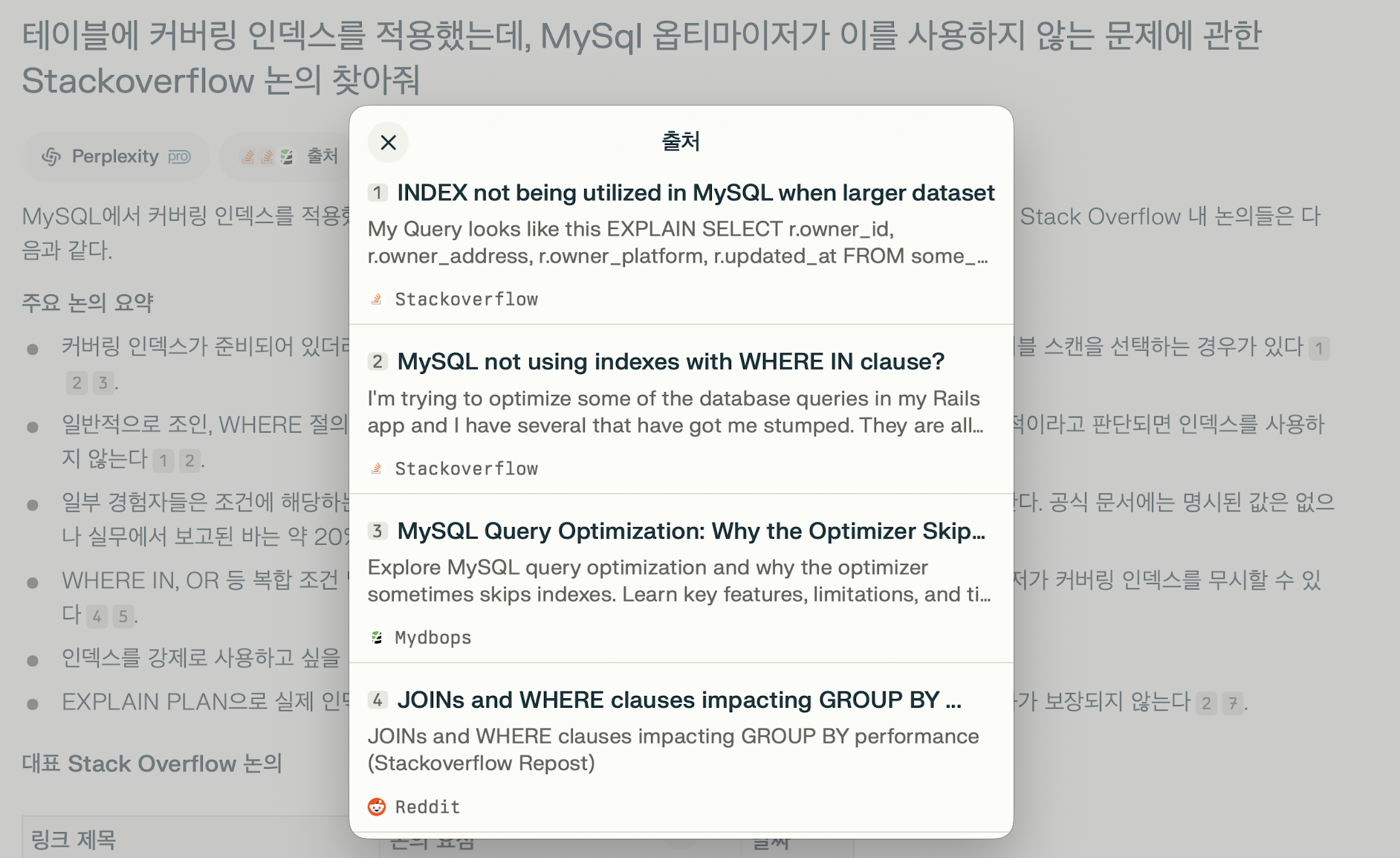 Perplexity는 출처기반의 답변을 통해 실제 stackoverflow등 여러 출처에서 논의된 내용을 찾을 수 있게 해준다.