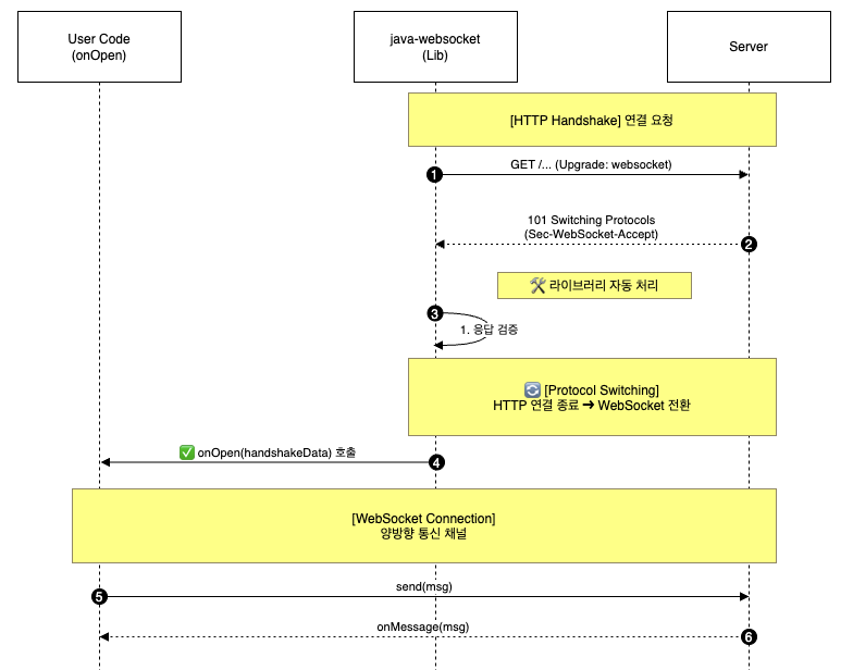 - 이 모든 과정을 `java-websocket` 라이브러리는 위의 과정을 자동으로 처리해준다.