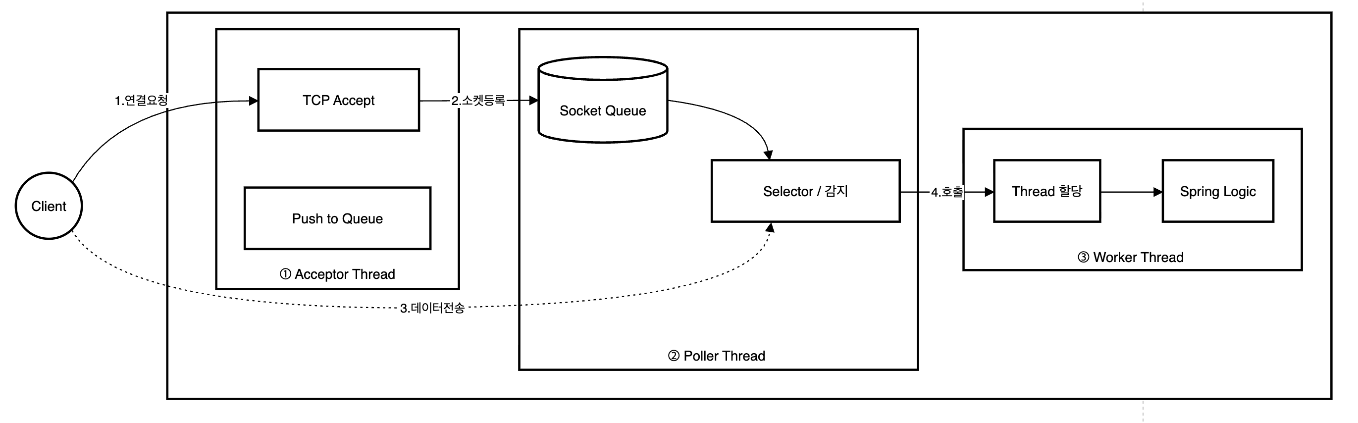 톰캣이 보이지 않는 곳에서 NIO(Non-blocking I/O) 방식으로 연결을 효율적으로 제어하고,