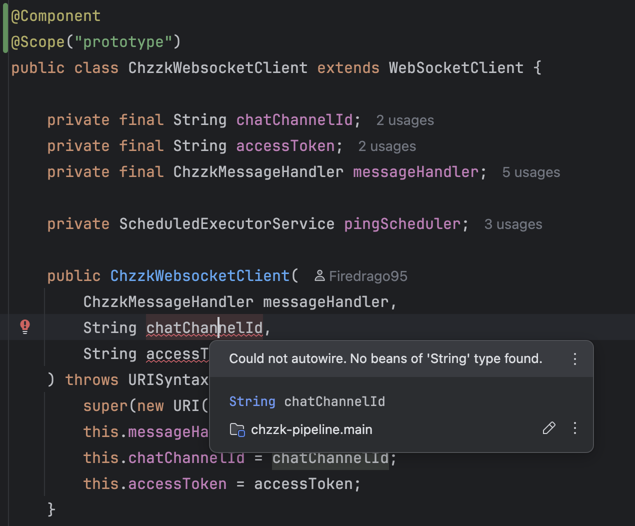 이제 ChzzkWebsocketClient 객체는 Ioc 컨테이너가 관리하되,
