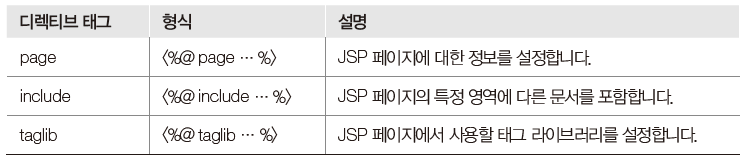 반면 디렉티브 태그는 JSP 페이지를 서블릿 클래스로 변환할때 Tomcat 과 같은 JSP 컨테이너에 지시하는 메시지다.