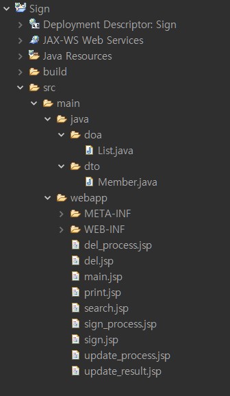 sign.jsp로부터 전달받은 파라미터를 변수처리하고 , Member 객체에 넣은 뒤 , List 객체의 ArrayList에 담는다.