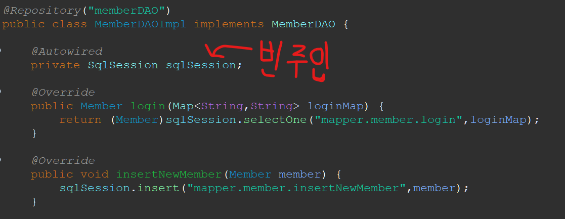 DAOimpl 에서 sqlSession을 주입하고 결과값을 받아오는 코드